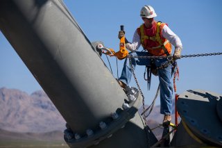 Workers utilize cranes to install the heliostats. The posts are pounded to the desert floor—rather than becoming anchored to concrete foundations—to restrict their impact.